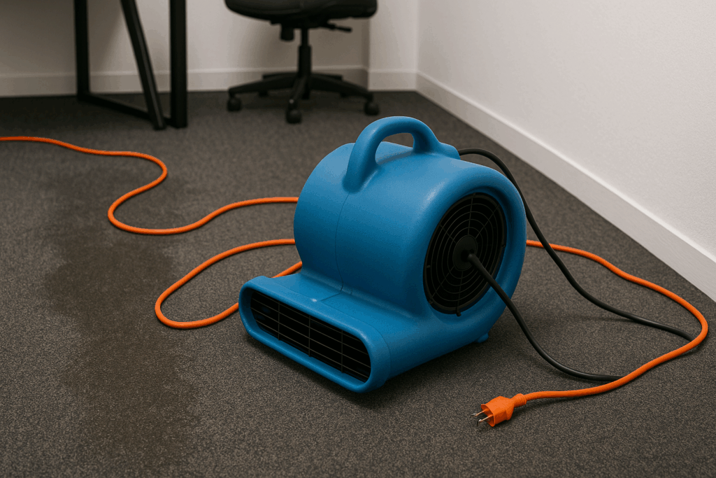 At Business Cleaning Solutions, we bring in industrial-grade air movers that cut drying time dramatically compared to household fans, which is vital for preventing mold in carpet from water damage.